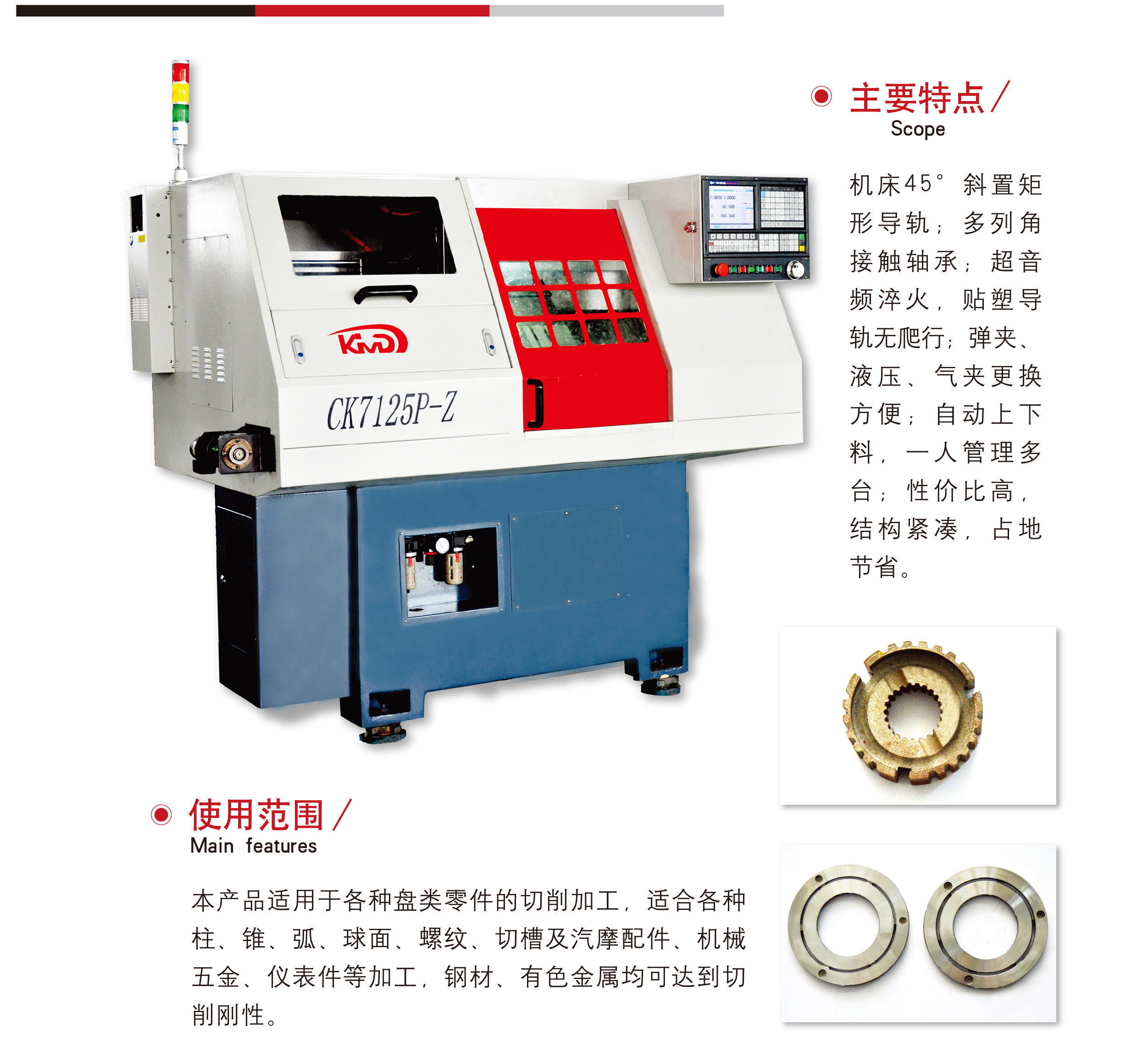 簡要描(miáo)述: 機床(chuáng)45°斜置矩(jǔ)形導軌(guǐ);多列角(jiao)接觸軸(zhou)承;超音(yīn)頻淬火(huo)♈, 貼塑導(dao)💰軌無爬(pá)行;彈夾(jia)、液壓、氣(qì)夾更換(huàn)方便;自(zì)動上 下(xià)料📐,一人(ren)管理多(duō)台;性價(jià)比高,結(jie)構緊湊(còu),占地節(jiē)省。