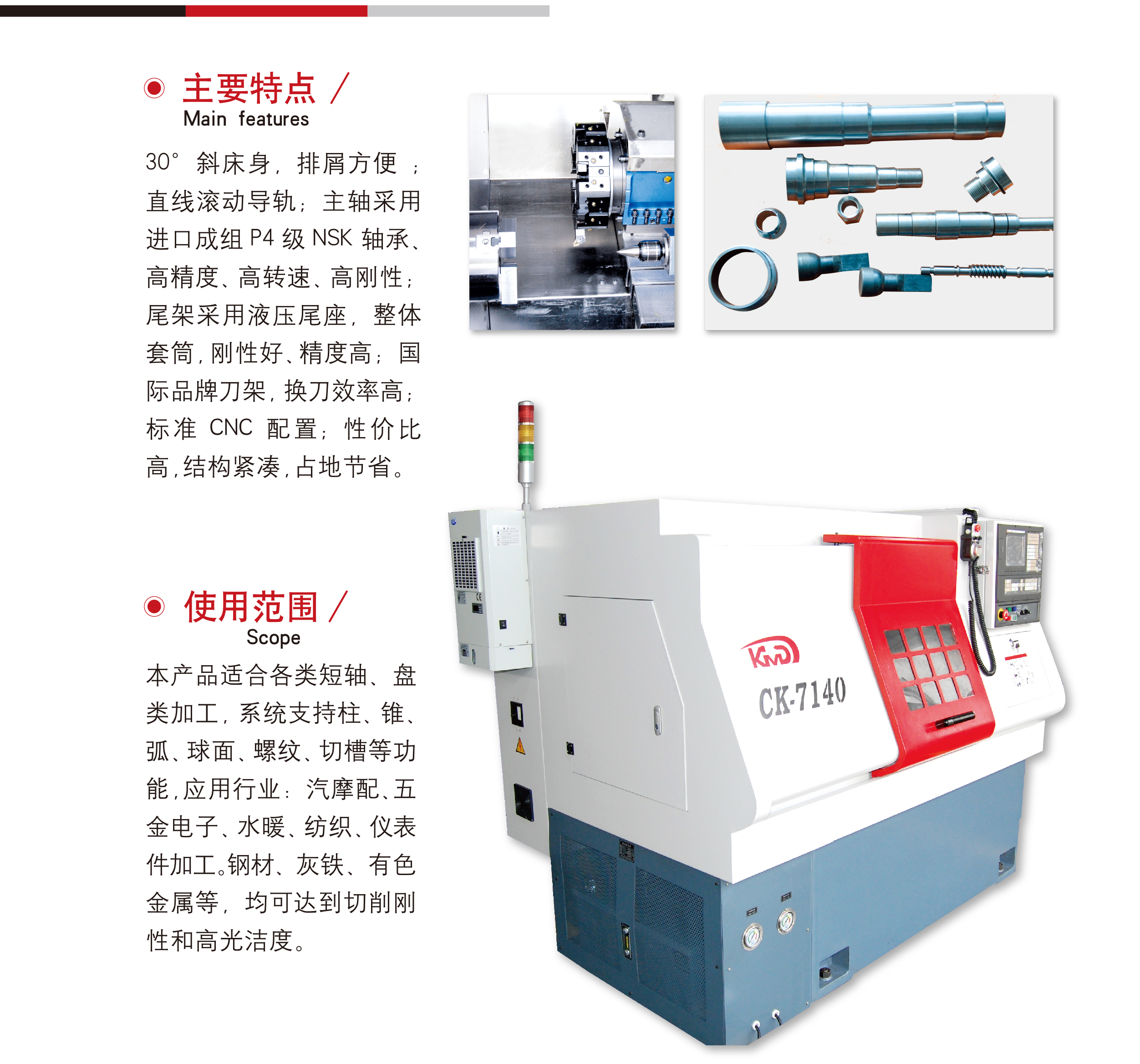 簡要描(miao)述: 30度斜(xié)床身,排(pái)屑方便(bian);直線滾(gun)動導軌(guǐ);主軸采(cai)用進口(kou)成組P4級(jí)NSK軸♍承,高(gao)精度、高(gao)轉速、高(gāo)剛性;尾(wei)架采用(yong)液壓尾(wei)座,整體(tǐ)套筒,剛(gāng)性好、精(jing)度高;國(guo)際品牌(pái)刀架,換(huàn)刀效率(lü)高✨;标準(zhǔn)CNC配🆚置,性(xing)價比高(gāo),結構緊(jin)湊📞,占地(di)節省。