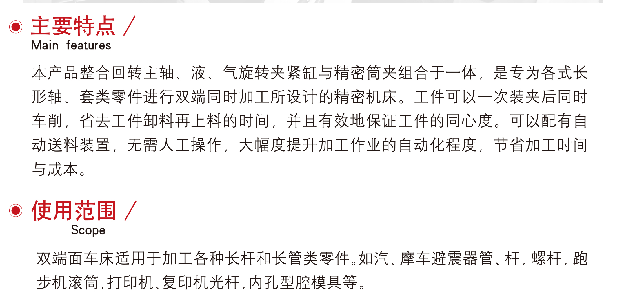 簡(jiǎn)要描述: 本(ben)産品整合(hé)回轉主軸(zhou)、液、氣旋轉(zhuǎn)夾緊缸與(yǔ)精密筒夾(jia)組🧑🏽‍🤝‍🧑🏻合于一(yī)體,是專爲(wèi)各式長形(xíng)軸、套類零(líng)件進行雙(shuāng)端同時加(jiā)工所設計(ji)的🌍精密機(jī)床。工件可(kě)以一次裝(zhuang)夾後同時(shí)車削,省去(qù)工件卸🔱 料(liào)再上料的(de)時間,并且(qiě)有效地保(bao)證工件🍉的(de)同心度。