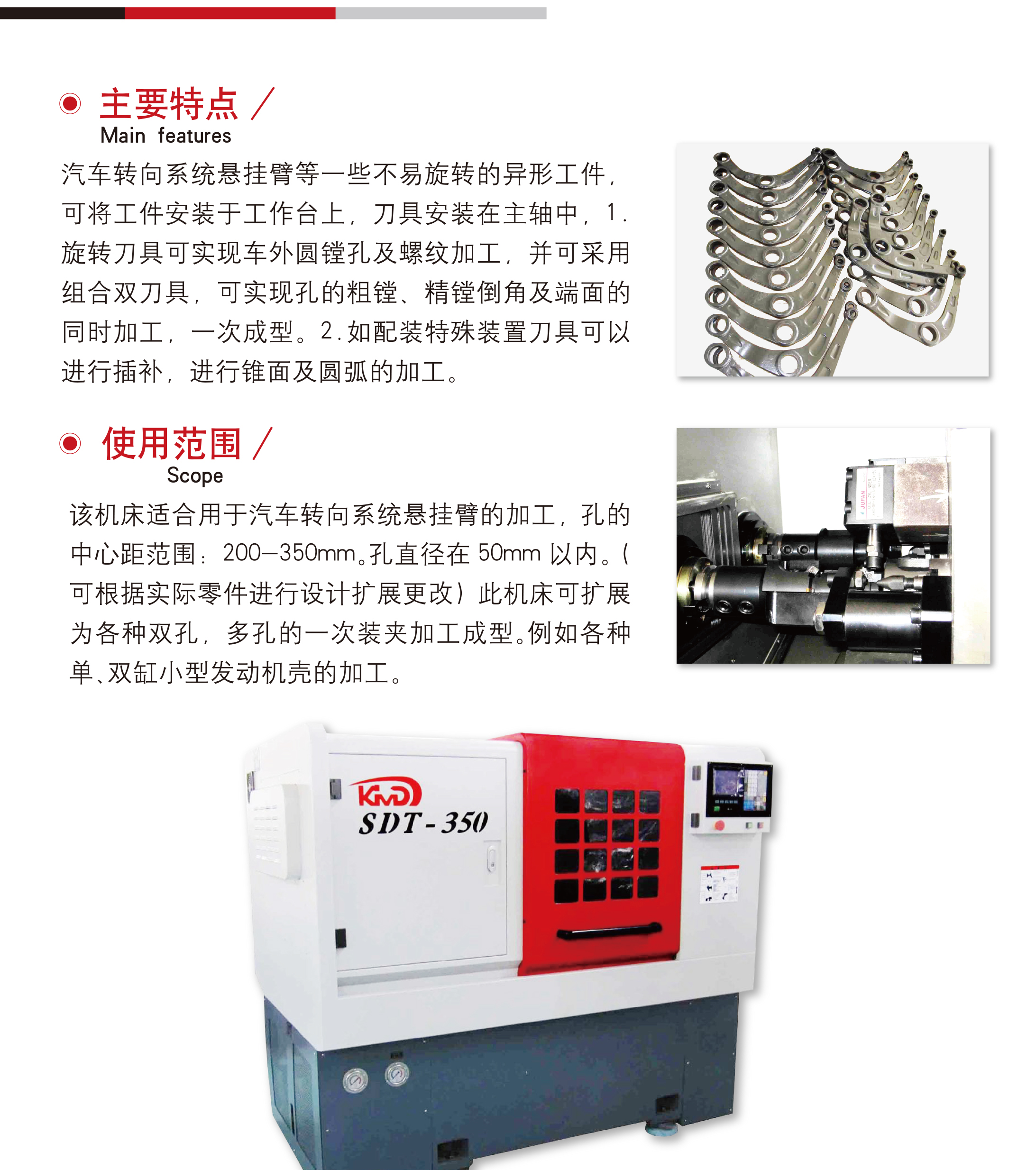 汽車轉(zhuan)向系統懸(xuan)挂臂等一(yī)些不易旋(xuan)轉的異形(xíng)工件,可将(jiang)🙇🏻工件安裝(zhuang)于工作台(tái)上,刀具安(ān)裝在主軸(zhóu)中,1 旋轉刀(dao)具可實現(xiàn)車外圓镗(tang)孔及螺紋(wén)加工,并可(ke)采❗用組合(he)雙刀具,可(kě)實現孔的(de)粗镗、精镗(táng)倒角及端(duan)面的同時(shí)加工,一次(cì)成型。