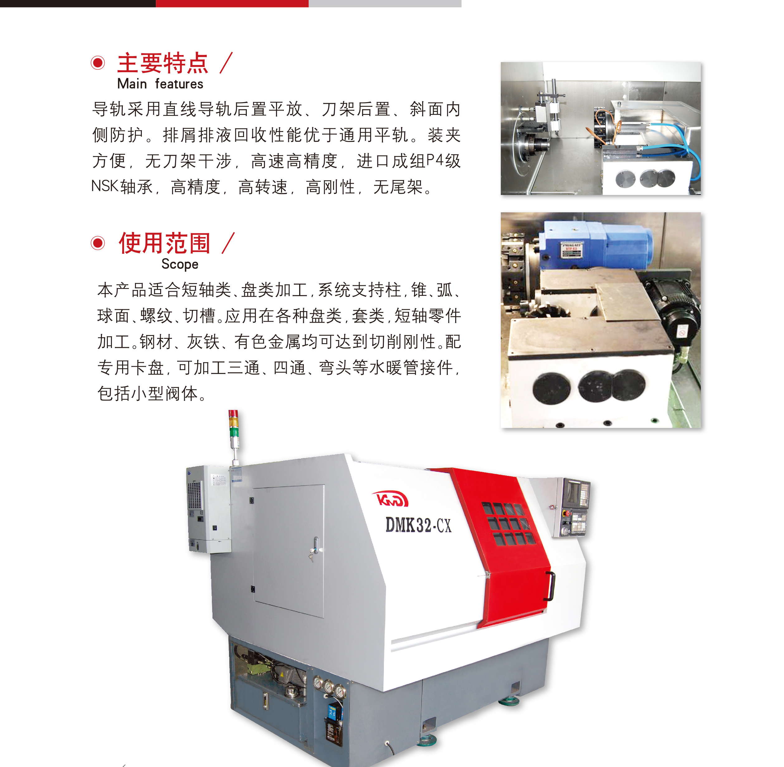 簡要(yao)描述: 導軌采用(yòng)直線導軌後置(zhì)平放、刀架後置(zhì)、斜面内側防護(hu)。排屑📱排液回收(shou)性能優于通用(yong)平軌。裝夾方便(bian),無刀架幹涉,高(gāo)速高精度,進口(kǒu)成組P4級NSK軸承,高(gao)精度,高轉速,高(gao)剛性⛷️,無尾架。